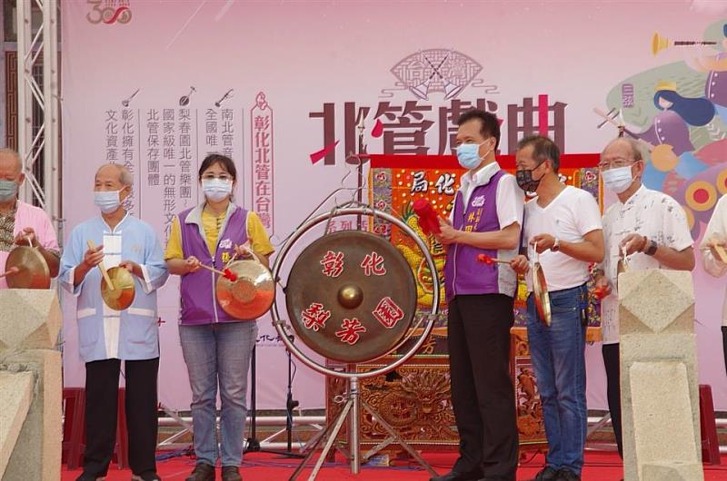 (中央社訊息服務20220725 10:25:37) 台灣北管戲曲音樂節壓軸場,於24日上午在彰化孔廟辦理「亂彈鬥熱鬧-北管排場大會」,重現北管「軒園咬」熱鬧歷史場景,由副縣長林田富代表縣長王惠美與會欣賞。晚上6:30將接續由梨春園北管樂團演出子弟戲-「天官賜福」,歡迎民眾共襄盛舉。