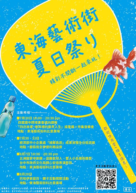 (中央社訊息服務20220729 14:48:37)臺中東海藝術街商圈,於7月30日(六)至8月31日(三)舉辦「東海藝術街夏日祭」,推出系列活動,內容包括成果展覽、親子闖關、音樂市集以及魔術表演等,非常適合朋友與家庭同樂,喜歡藝術的大朋友小朋友千萬別錯過,一起來體驗美好的暑期時光。