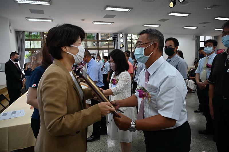 縣長饒慶鈴贈送已故前寧埔國小校長林龍泉紀念品,由其遺孀邵雅倩校長受領,也感念東海國中賴亮禎、知本國中周正雄、長濱國中張新發、東海國小黃裕敏、鸞山國小田桂香等5位退休校長無私奉獻,希望新任校長為臺東教育帶來新氣象,為學子打造適性多元的學習環境。
