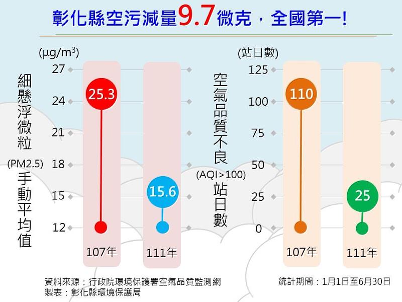 (中央社訊息服務20220801 16:31:49)根據行政院環保署數據,彰化縣111年1~6月PM2.5平均值15.6微克,較107年同期下降9.7微克,減量全國排名第一,可望於今年提前達成112年全國空品標準目標(15微克);另外空品改善策略奏效,空氣品質指標(AQI)不良日數逐年顯著下降,111年1~6月空品不良(AQI>100)累計天數25天,相較107年減少85天,改善近8成,各項污染物也呈下降趨勢。