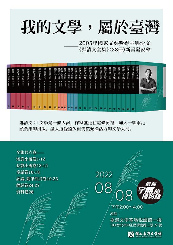 (中央社訊息服務20220802 11:33:41)最特別的父親節獻禮!由女兒鄭谷苑親自主編的《鄭清文全集》,新書發表會8月8日(星期一)14:00在臺灣文學基地舉行。