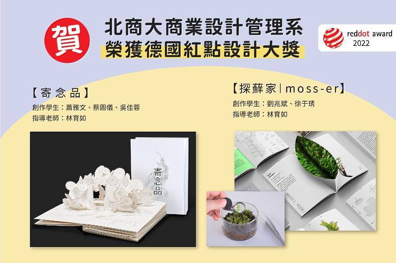(中央社訊息服務20220804 10:46:05)國立臺北商業大學商業設計管理系林育如老師,指導學生畢業專題製作,今年以畢業專題作品「探蘚家」、「寄念品」角逐紅點設計「品牌暨傳達設計」獎項,在全球優秀強敵環伺下雙雙獲獎,分別榮獲「品牌與識別類」與「出版和媒體印刷-圖書類」兩項目獲獎。林育如老師表示,教學指導創作上給予學生獨立思考、多元嘗試、自由發揮與創造的空間,透過議題式的深入探討,以及對本土文化的人文關懷,深厚設計轉譯的內涵與底蘊,充分展現北商大商設系師生的跨界創新設計能量。