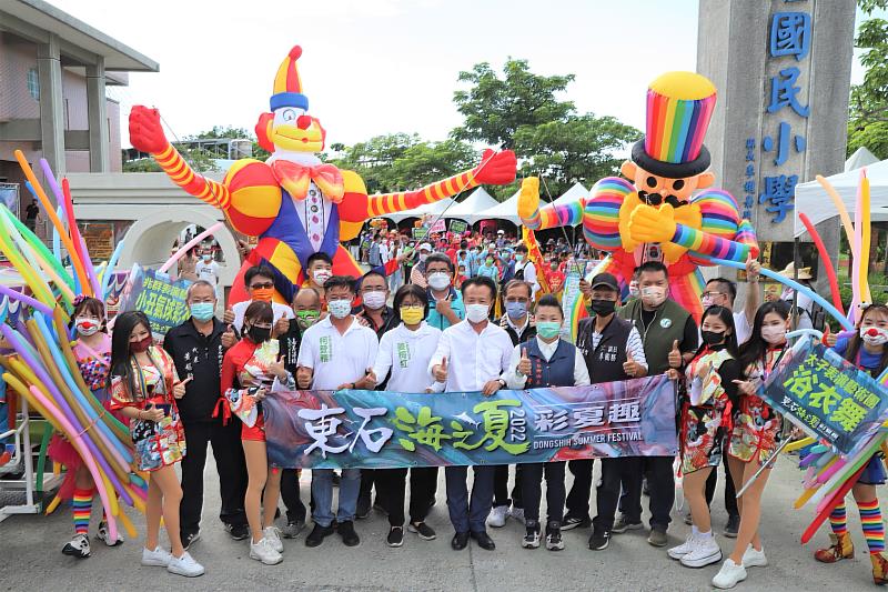 翁章梁、東石鄉長林佳瑩、縣議員姜梅紅、李國勝、文觀局長許有仁共同擊鼓象徵海之夏開跑,踩街隊伍五彩繽紛吸引眾多孩子圍觀,翁縣長沿街發氣球、糖果,民眾熱烈呼應嗨翻天,終點站先天宮前擠滿人潮,鄉親共襄盛舉。