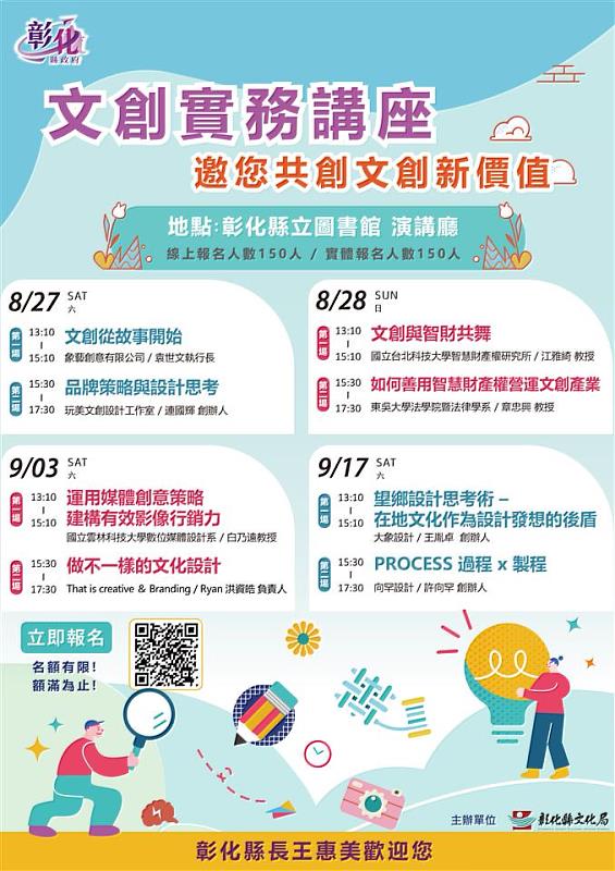 (中央社訊息服務20220820 11:06:37)隨著國內新冠疫情逐漸趨緩,國人逐步回歸正常生活,各行各業也積極準備復甦、拚經濟!文創相關工作者更期待有亮眼業績。有鑒於此,為培育在地文創業者和設計創作者提升知能、激發創作能量與開發產品之創意,彰化縣政府將於8/27、8/28、9/3、9/17邀請文創業界名師,在彰化縣立圖書館演講廳舉辦8場「文創實務講座」,建立本縣文創完善知識體系,有助於提升市場競爭能量。為了嘉惠更多對文創有興趣的民眾,能吸收文創產業新知和創業技巧,本課程特別採實體與線上直播同步進行,名額有限,各招收150位學員,使用QR Code線上報名,亦可連結線上報名表單:https://reurl.cc/8p5KXy。