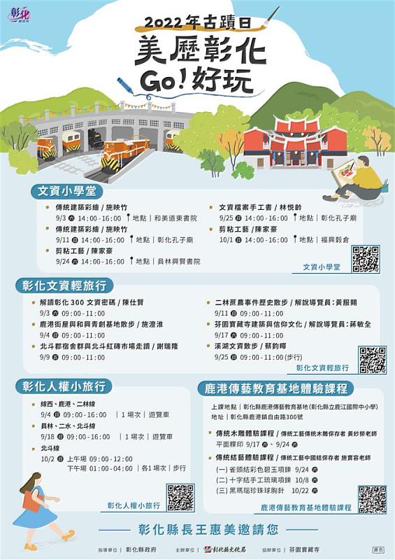 2022年古蹟日「美歷彰化GO!好玩」系列活動-文資小學堂、文資輕旅行、彰化人權旅行等路線,已開始受理報名,請上彰化縣文化局官網(https://www.bocach.gov.tw/cp.aspx?n=1501)查詢報名訊息,彰化縣文化局邀請您一起穿越歷史時空、暢遊文資彰化!