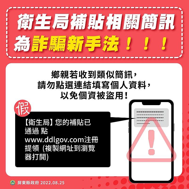 (中央社訊息服務20220825 14:50:39)近日許多民眾接到一則署名來自衛生局的簡訊,簡訊內容為「您的補貼已通過點www.ddigov.com注冊提領」,衛生局表示這是假訊息,且並未發送任何補助提領簡訊,提醒民眾切勿點選連結提供個人資料,以免個資外洩。