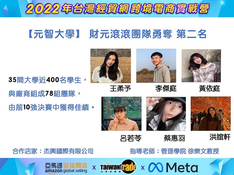 (中央社訊息服務20220831 11:40:38)第8屆「跨境電商實戰營」共有35所大專院校,近400位參賽同學,78組團隊,78家廠商參與。經歷兩階段篩選,元智大學管理學院二年級王柔予、洪誼軒、呂若苓、李傑庭、蔡惠羽及社政系黃依庭同學,在徐樂文老師指導下,榮獲亞軍殊榮。
