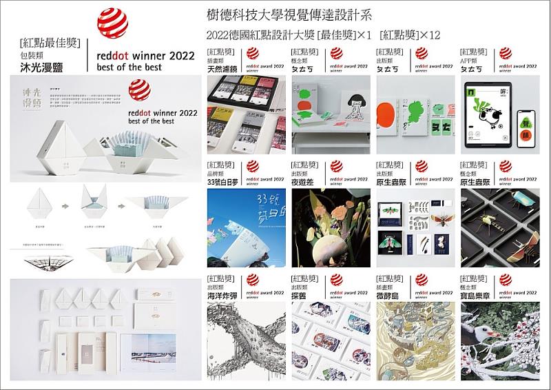 (中央社訊息服務20220831 14:22:28)2022德國紅點設計大獎 (Red Dot Award)成績出爐,樹德科大視覺傳達設計系(簡稱:視傳系)今年六月畢業前參賽的111級畢業製作成品,獲13個紅點獎,計58人獲獎;《沐光漫鹽》作品並獲「最佳獎」(Best of the Best)。該項畢業製作計有127人,得獎人數即占45.6%,成就非凡。德國紅點設計大賽獎項分別為紅點產品設計獎、紅點品牌暨傳達設計獎、紅點概念設計獎,獲獎作品皆可獲准使用「紅點標章」,是對設計師極其重要的肯定。
