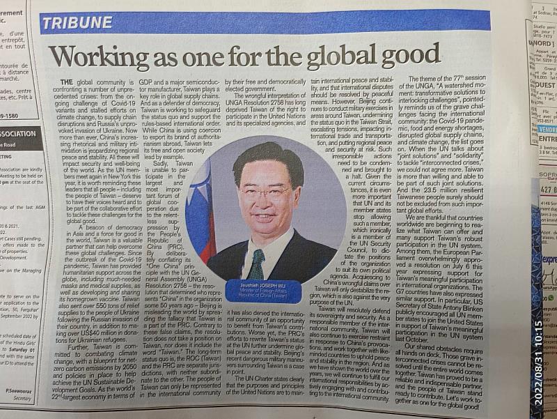 (中央社訊息服務20220901 09:19:50) 聯合國大會將於9月13日登場,模里西斯第一大報L’express於8月31日同時在紙本版及網路版刊登外交部吳部長釗燮有關我參與聯合國的專文,這也是模里西斯重要媒體,多年來第一次刊登我外交部長專文。