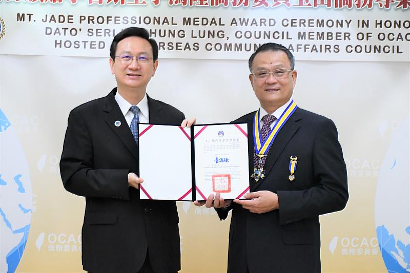 熱心慈善公益促進臺馬經貿交流 李鴻隆獲頒玉山僑務專業獎章
