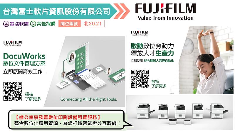 除攤位展示外,台灣富士軟片資訊也將在活動當日,進行「虛實整合X人機協作,打造全方位自動化應用服務,孕育企業關鍵競爭力!」主題演說,分享如何打造一站式的「機器人流程自動化」與「文件作業流程」解決方案。強調透過顧問團隊的專業評估與建議,協助企業以機器人或自動化輔助辦公流程,同時串聯數位商務辦公解決方案,無痛進行流程優化與數位轉型,以全面提升辦公效率和員工生產力、強化企業關鍵競爭力。