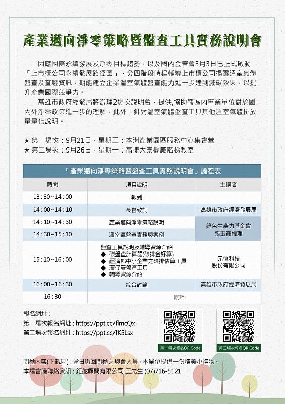 (中央社訊息服務20220907 14:24:20)高雄市政府積極推動淨零減碳,為協助在地企業盤查製程設備碳排放情形,經發局今(7)表示已規劃9月21日及26日於本洲產業園區服務中心、高雄捷運大寮機廠舉辦兩場「產業邁向淨零策略暨盤查工具實務」說明會,邀請業界專家解說淨零排放執行內容,並實際演練碳盤查工具、介紹資源,呼籲企業把握機會報名參與。