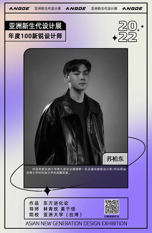 (中央社訊息服務20220912 09:44:43)亞洲大學時尚系同學蘇柏東,以作品「東方進化論」榮獲2022 ANGDE亞洲新生代設計展金獎,及年度100新銳設計師。陳芷妤同學也以作品「囍」,獲選年度100新銳設計師。