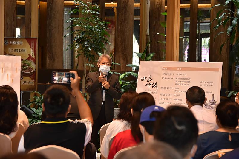葉宗和院長致詞表示,很高興有機會在「南院旅墅」舉辦美食水墨展,希望能跨出這關鍵的一小步,成就未來繪畫與美食結合的一大步。葉教授再指出,當代水墨藝術正從出世煙雲回歸到入世關懷,藉由審美素養來關心地方生活與產業發展。嘉義市素有「畫都」之美譽,也標榜特色美食小吃,每逢假期總是擠滿了聞香人潮,這就是飲食的魅力,若能融入繪畫的精神本質,品嚐一道美食也能體驗一個文本故事,不僅滿足了胃,也能讓精神達到振奮,一舉數得,因此形塑美食故事是當代行銷很重要的策略手法,對於提振地方創生具有相當大的指標。開幕活動結束前,特地邀請嘉義市文藝作家協會榮譽理事長林家儀,在現場書寫了「回家呷飯幸福滋味」八個字送給南院旅墅,並祝福回到嘉義旅遊吃美食的遊客,就好像回到了自己的家,品嚐著其中的幸福好滋味,受到在場與會來賓與觀禮民眾如雷掌聲的讚賞。