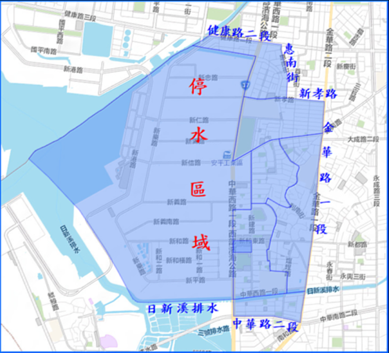 本次停水區域影響範圍為台南市南區光明里、開南里、鹽埕里、南華里、彰南里、國宅里、文南里(健康路二段以南、中華西路一段以西)、金華里(健康路二段以南、惠南街以西),用戶數計10829戶,除停水區域外,其餘地區可正常供水;惟於復水時管線末端、大樓及地勢較高之地區,可能稍有延遲情形。