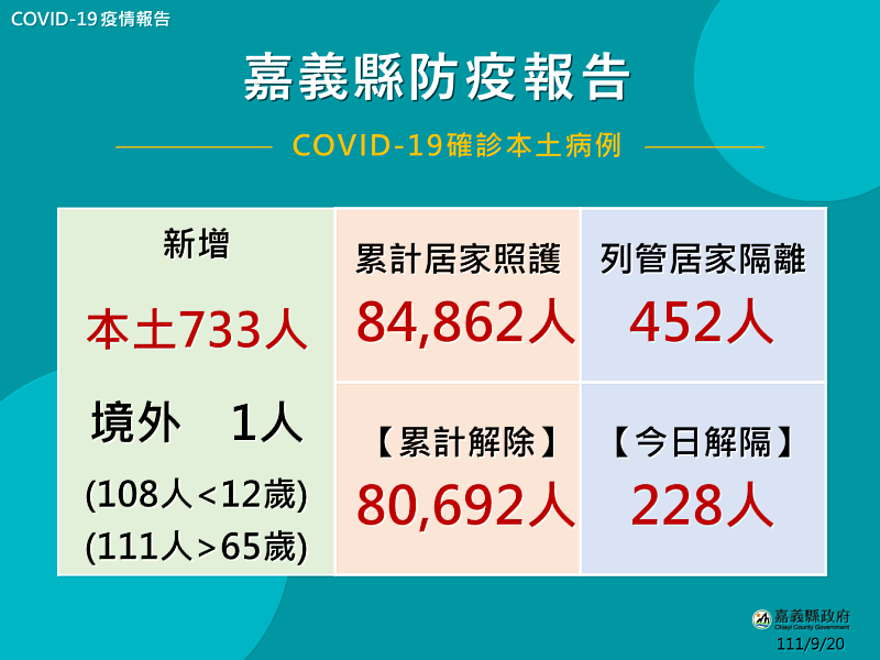 (中央社訊息服務20220920 18:02:44)嘉義縣20日公布734人確診(含境外1人),其中有症狀149人,無症狀585人。年齡介於5月至93歲,12歲以下108人,65歲以上111人。累計全縣12歲以下染疫幼童11,789人,65歲以上12,366人,目前居家隔離452人,輕症居家照護4,170人。