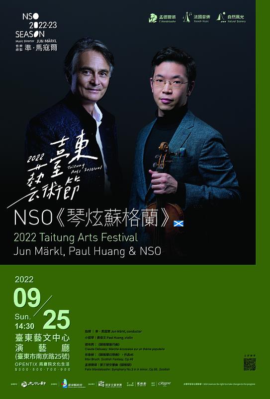 (中央社訊息服務20220923 13:36:11)東臺灣具指標性的表演藝術盛事「2022臺東藝術節」,在臺東縣政府文化處力邀之下, NSO國家交響樂團睽違九年再度以大型管絃樂編制將於9月25日移師臺東,推出《琴炫蘇格蘭》音樂會,由音樂總監準‧馬寇爾(Jun Märkl)親自帶領全團,與旅美小提琴名家黃俊文,於臺東文化中心演藝廳盛大呈現以「蘇格蘭」為題的三大作品,展現德布西瑰美秀麗的《蘇格蘭進行曲》、布魯赫夢幻淒美的《蘇格蘭幻想曲》,以及孟德爾頌筆下既抽象又滿懷情感的第三號交響曲《蘇格蘭》。