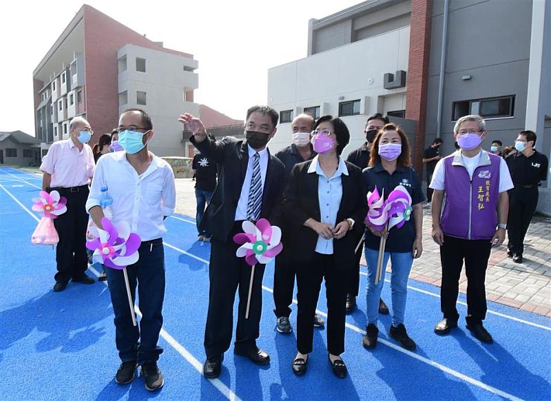 (中央社訊息服務20221004 10:31:54)彰化縣政府補助鹿江國際中小學辦理第一、二期校舍新建工程經費後,考量學校缺乏大型集會場所及運動活動空間,為了健全孩子們的身心發展,再補助第三期校舍新建工程經費,新建1棟活動中心及1座200公尺操場(含籃球場、座位席、運動傷害防護室等),3日上午舉行竣工典禮,彰化縣長王惠美主持竣工儀式。活動中心及操場的完成將可提供全校師生大型集會場所及運動活動空間,也提供社區居民一個優質的運動休閒環境。