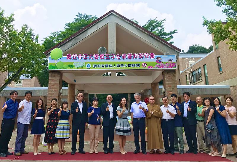 (中央社訊息服務20221005 16:59:03)為提供優質和平價之托育服務,減輕家長育兒負擔,國立中正大學委託南華大學辦理嘉義縣第三所非營利幼兒園-「國立中正大學員工子女非營利幼兒園(委託財團法人南華大學辦理)」, 10月5日上午舉行揭牌儀式暨感恩茶會,由嘉義縣政府教育處長李美華和國立中正大學馮展華校長,以及南華大學林聰明校長,共同主持揭牌儀式。