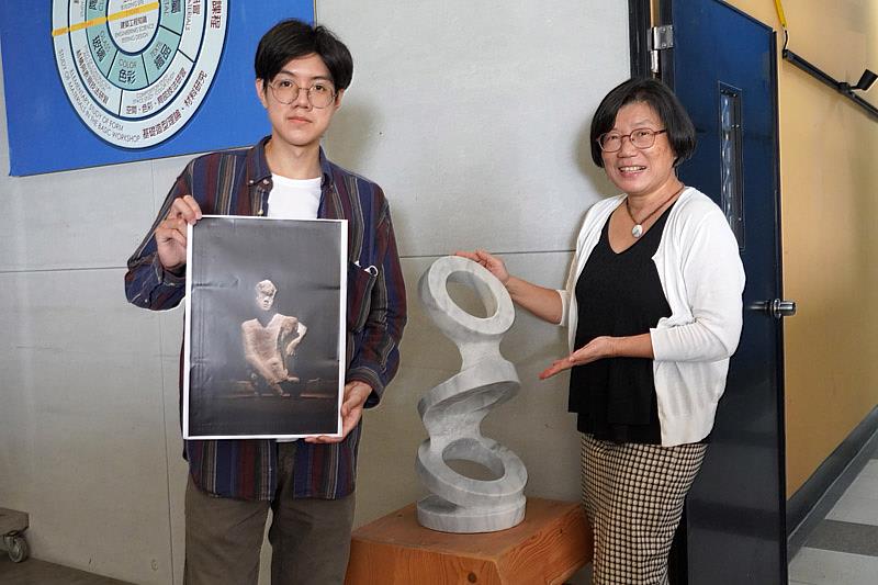 造藝系主任廖秀玲指出,文化部指導、國立臺灣美術館主辦的「111年全國美術展」,分成雕塑、水墨、書法、篆刻、膠彩、油畫、水彩、版畫、攝影、新媒體藝術、綜合媒材11個類別,開放全國藝術家參加,今年多達990件作品角逐榮耀,競爭非常激烈。李伯元同學是一位認真學習又有想法的創作者,在大學時期以「石雕藝術的瞬間性與連貫性動態」榮獲國科會大專生計畫獎助,碩士班階段的石雕創作則在宜蘭獎、桃源美展等賽事受到肯定,此次入選全國美術展的「盲軀」,作品成熟度高,在具象裡融入抽象的技法,解放形體時又保留了質感,最特別的是,他不只是以石頭為材料,也選用鐵道舊枕木當作品的基座,從生活尋找元素,讓物件與人產生關係,成為作品的語彙。