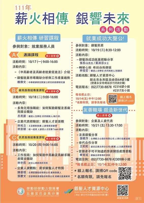 「薪火相傳研習課程」則是針對就業服務人員所設計的教育訓練,藉由提升相關領域的專業知識及職能,協助其發展中高齡及高齡者就業促進服務業務。同時透過經驗回饋與交流,發揮資源網絡聯繫與整合的功能,讓有就業需求的民眾或有求才需求的企業雇主能獲得更高品質的服務。欲了解更多活動資訊,可上銀髮人才資源中心官網https://swd.wda.gov.tw/ 及Facebook粉絲專頁查詢,或致電(02)7730-8878由專人服務。