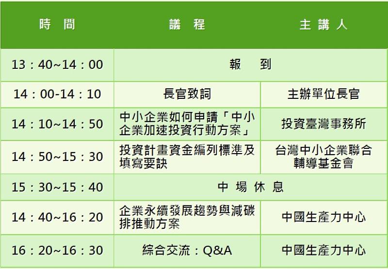 說明會內容,將提供有意申請方案之企業了解如何申請方案及準備資料,同時安排講解投資計畫資金編列標準及填寫範例,提升企業送交投資計畫書之內容完整度及投資資金落實執行之可行性;另針對方案申請落實減碳排目標,將建議及輔導中小企業前瞻規劃及追求永續經營,具備綠色轉型之思維與做法。