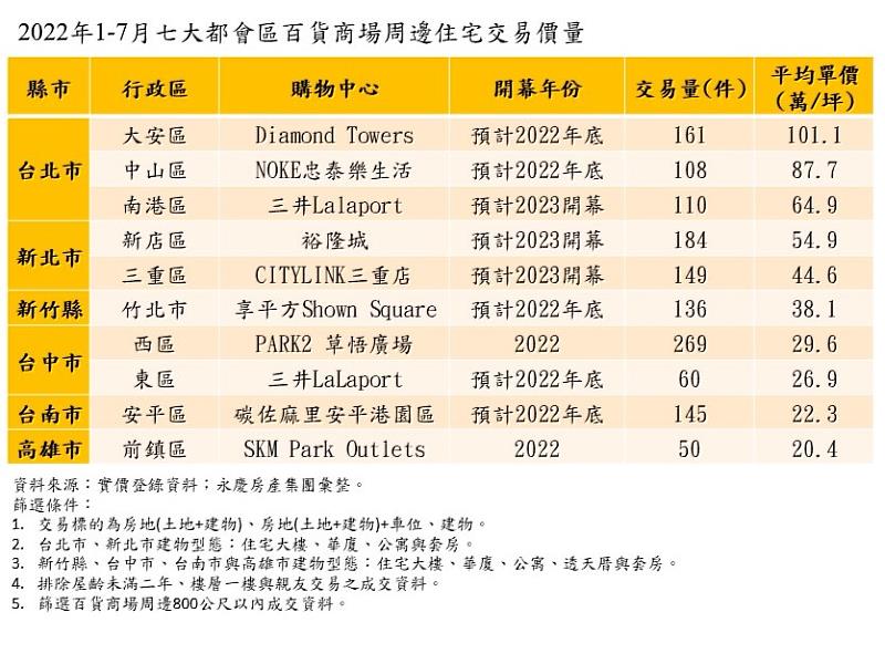 表、2022年1-7月七大都會區百貨商場周邊住宅交易價量