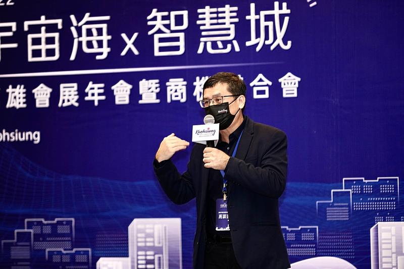 (中央社訊息服務20221014 17:26:07)高市府經發局為活絡會展商機,今(14)以「宇宙海.智慧城」為主題,在萬豪酒店舉辦高雄會展年會暨商機媒合會,邀請到樺致形象設計有限公司創意總監楊佳璋、叁式有限公司創意總監曾煒傑、數位時代創業小聚社群總監陳凱爾等多位獲頒多項國際大獎肯定策展人及HTC亞太區產品暨行銷總監佘昭龍等專家與談,交流最新策展經驗及5G AIoT、元宇宙等科技在會展的創新應用,吸引近百家業者齊聚。