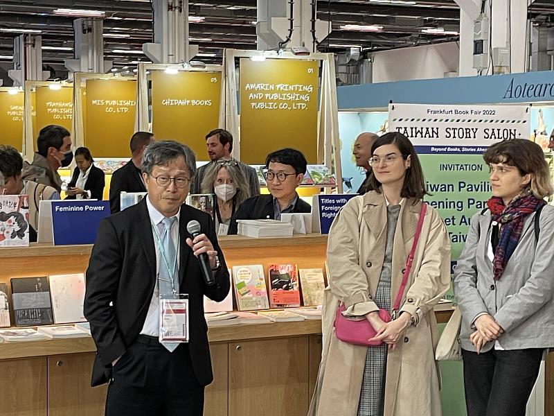 文策院院長李明哲表示,臺灣的自由創作環境,讓作品能呼應國際尊重多元的普世價值,因而使臺灣出版作品常獲國際青睞,是臺灣產業前進海外市場的獨特優勢,文策院期盼以出版品作為出發點,向國際推廣臺灣故事的魅力,促成更多臺灣文化內容的轉譯與合作。李明哲同時也感謝文化部與柏林文學學會(LCB)合作的「臺德文學交流合作計畫」,讓臺灣作者藉由國際駐村經驗與文策院整合資源,於重點市場上強化與國際出版產業緊密的關係。謝志偉在開幕活動現場致詞表示,對於能在疫情過後再次回到臺灣館感到高興,並分享「讀」與「寫」兩詞之於臺灣出版與臺灣館參加法蘭克福書展的意義,更以『Solidarity』一詞描繪了讀者與作者之間緊密的關係,以及臺灣與烏克蘭在追求民主道路上是同一陣線。