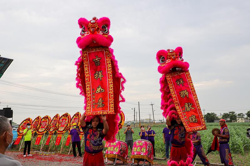(中央社訊息服務20221024 09:21:14)嘉義縣義竹鄉龍蛟村進村路口,因舊牌樓年久,今年2月進行整修,10月順利完工,今於全新牌樓前搭建舞台,恭請寺廟神明(李府千歲)至路口讓信眾參拜,並邀請嘉義縣長翁章梁、立法委員蔡易餘等貴賓出席,慶祝全新牌樓落成。