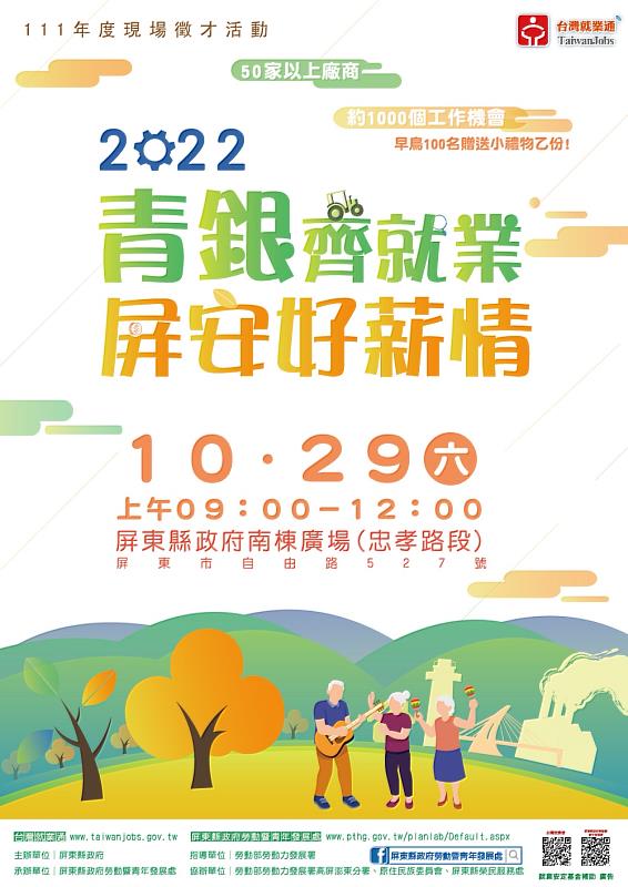 (中央社訊息服務20221025 14:44:20)屏東縣政府勞動暨青年發展處訂於111年10月29日(六)上午9時至12時於屏東縣政府南棟廣場(忠孝路段)屏東市自由路527號辦理「青銀齊就業.屏安好薪情」現場徵才活動,邀請50家以上廠商蒞臨共襄盛舉,提供超過1200個工作職缺。