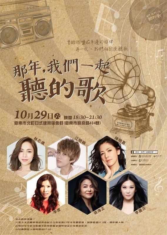 (中央社訊息服務20221026 16:59:57)臺東縣政府舉辦「那年,我們一起聽的歌」2022年度最終場,將於10月29日在臺東市北町日式建築宿舍群辦理,從下午6點30分邀請到有「長腿姐姐」之稱的陳明真、李麗芬、裘海正、李度、林芯儀、江明娟等6位魅力女聲,再次颳起女力旋風,活動免費開放入場,歡迎臺東鄉親好朋友一起相約來聽歌,可自行攜帶椅子及野餐墊舒服的享受演唱會。