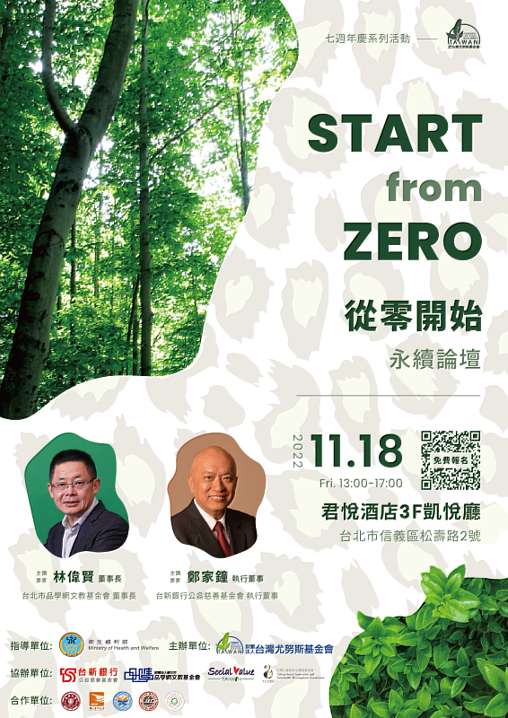 (中央社訊息服務20221111 11:17:05)財團法人台灣尤努斯基金會於11月18日(五)13:30-17:00假台北君悅酒店舉辦【Start from Zero 從零開始】永續論壇,基金會竭誠地邀請關注永續議題的專家學者及有志青年,共同探討疫情後的青年創業及社會創新。諾貝爾和平獎得主尤努斯博士也親自錄製短片,為本論壇分享疫後永續發展的契機及願景,優質論壇免費報名:https://forms.gle/GPdKZqZa8VLfPvUN9