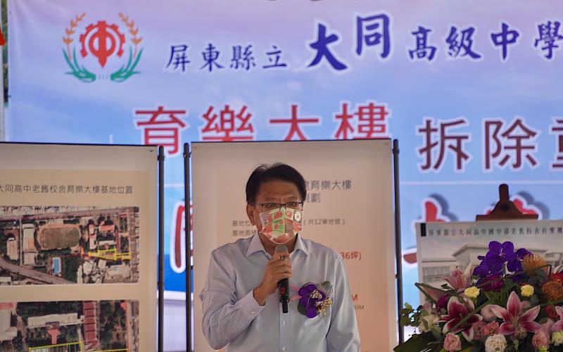 縣長潘孟安表示,大同高中育樂大樓重建是全體師生期待很久的心願,特別感謝立委周春米向行政院爭取專案補助,讓這棟40年老背少的建築經費能一次到位,除盼工程如質完工外,甚至希望提早竣工,並請學校端將整體校園重建規劃融入美學,以便讓學生早日能安全地在教室上課,新建校舍完工後,將提供師生一個安全、明亮與新穎的教學環境。