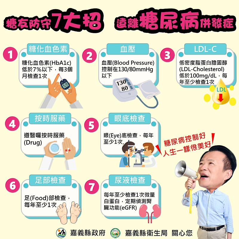 嘉義縣長翁章梁指出,糖尿病友除了規則就醫用藥外,應把握7大招,降低併發症發生,包括:「糖化血色素」要低於7%以下,每3個月檢查1次;「血壓」控制在130/80mmHg以下;「低密度脂蛋白膽固醇」低於100mg/dL,每年至少檢查1次;「遵醫囑按時服藥」;「眼底檢查」每年至少1次;「足部檢查」每年至少1次;每年至少檢查1次「尿液微量白蛋白」,定期偵測腎臟功能(eGFR),防止併發症的傷害。