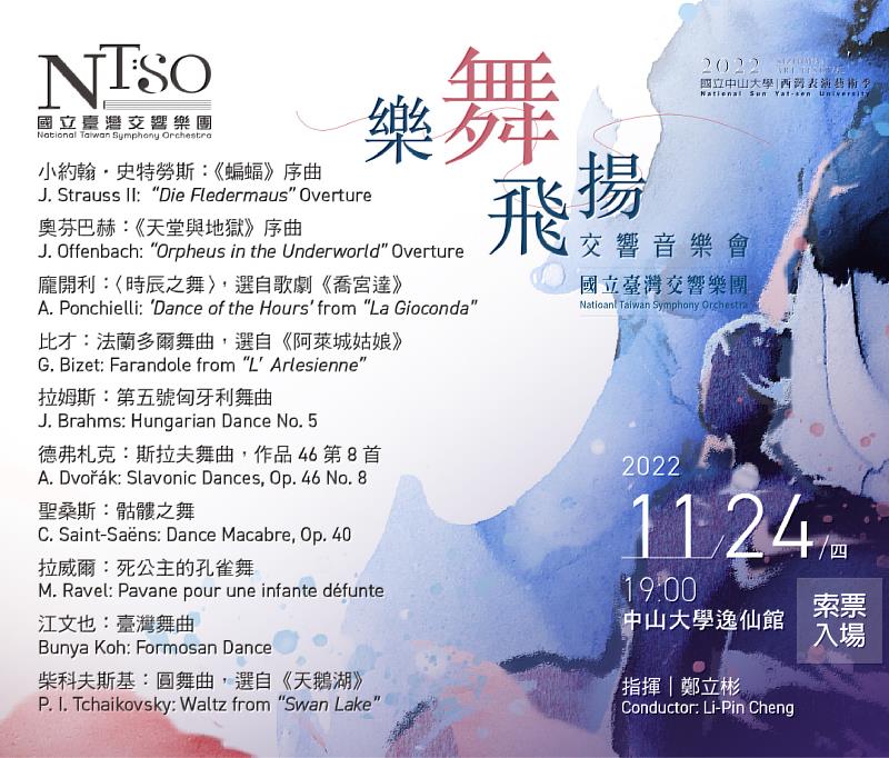 (中央社訊息服務20221118 15:36:42)國立臺灣交響樂團(簡稱「國臺交」)推動全民藝文欣賞參與不遺餘力,除在專業廳堂演出之外,亦將古典音樂以各種形式帶到臺灣各角落,實踐文化平權,落實藝教扎根。11月24日晚間七點於中山大學逸仙館演出,在「2022中山西灣藝術季聽藝潮」藝術季中,以編制約80人之完整交響樂團規模,於設有1300多座位的中山大學逸仙館演出,將悠揚的音樂,帶入校園。本次由演出經驗豐富、任教於中國文化大學的指揮家鄭立彬擔任指揮,與NTSO攜手演出耳熟能詳的古典音樂經典作品,並且由指揮親自擔任樂曲解說,音樂會除提供學校師生入場,亦自即日起開放民眾索票欣賞。在校園裡就可欣賞國家級殿堂同等之音樂饗宴,機會難得,敬請把握。