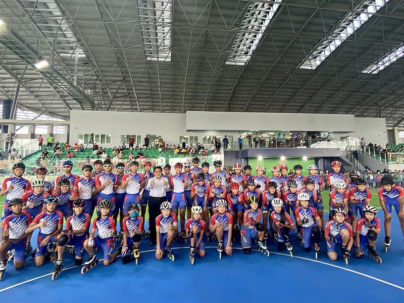 潘縣長表示,為持續推動屏東滑輪溜冰發展,屏東縣政府積極向教育部體育署爭取經費,及縣府自籌預算,合計約4.5億元,在屏東縣潮州鎮打造符合最新國際賽事規格的半室內拋物線型200公尺賽道溜冰場,可容納逾1,000名觀眾進場觀賽。以國際規格興建溜冰場,不僅可提升選手的訓練品質,更是國內、日本、韓國及周邊國家選手移地訓練之第一選擇,並有助於爭取全國性及國際級滑輪溜冰賽事至屏東舉辦。