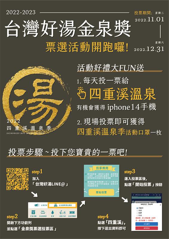 (中央社訊息服務20221122 15:06:08)有台灣溫泉奧斯卡之稱的「2022-2023台灣好湯金泉獎」已經登場!金泉獎票選活動即日起至12月31日票選期間,民眾只要加入台灣好湯官方Line@(https://lin.ee/uqZBT2l)就可以參加十泉十美獎的網路票選,請大家唯一支持四重溪溫泉,為四重溪溫泉區投下最關鍵的一票。