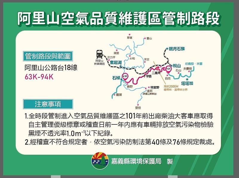 環保局運用2套AI車牌辨識系統及攔巡查作業,大客車配合空維區管制,進行檢測改善後符合規定約1,300輛,年減量約PM10:18.4公噸、PM2.5:17.1公噸。管制前4月30日(5月1日開始執行管制)於阿里山公路設置2台微型感測器,持續觀測器迄今並無異常狀況,維持阿里山良好空氣品質。