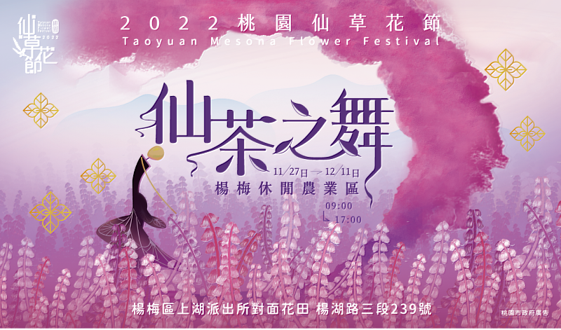 (中央社訊息服務20221129 09:24:51)有「台版普羅旺斯」美名,為期15天的「桃園仙草花節」,11/27(日)在楊梅休閒農業區盛大展出,現場12.5萬株的「桃園二號─香華仙草」紫色花海正浪漫綻放,今年以「仙茶之舞」為題,將茶湯意象貫穿整個展區,結合在地元素,推動在地農創市集、限定地方小旅行,更規劃六場亮點活動,其中內容包括舞蹈表演、結合在地仙草的獨創仙舞茶,以及農事體驗,讓民眾欣賞花海時還能體驗地方特色,展期自11/27(日)起至12/11(日),民眾免出國就能拍出絕美異國風情。
