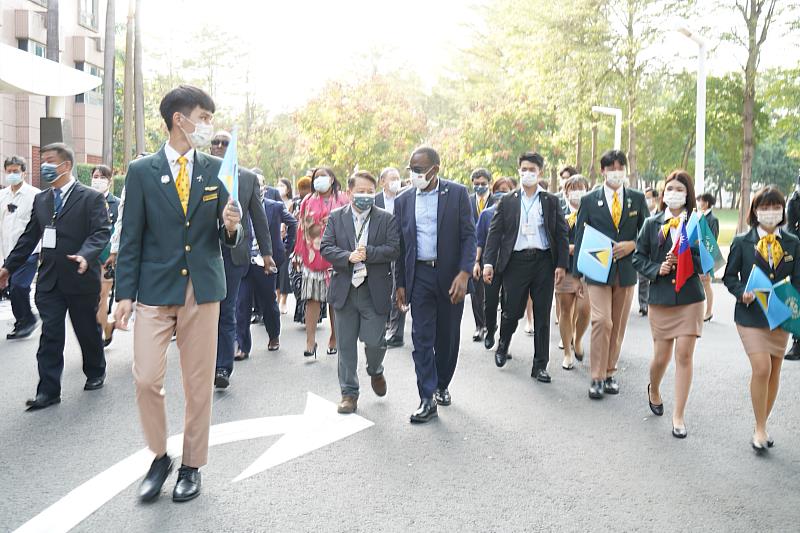 (中央社訊息服務20221201 18:26:14)國立高雄餐旅大學於今日(12月1日)接待聖露西亞總理皮耶(Prime Minister of Saint Lucia, Hon. Philip J. Pierre)及訪問團蒞臨參訪,聖露西亞為我國邦交國之一,並在台北設有大使館,訪團由外交部常務次長俞大㵢與我國官員陪同參訪,外交部特別安排該校協助我國觀光餐旅教育成果展示,由校長陳敦基率領主管與教職員工生熱情迎接,高餐大學生揮舞旗幟熱情歡迎,讓總理皮耶留下非常深刻的印象。