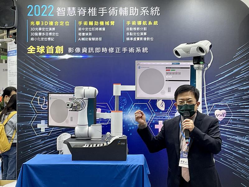 (中央社訊息服務20221205 13:30:15)經濟部技術處於南港展覽館台灣醫療科技展中,發表由金屬中心開發的「全球首創多椎節即時定位導航手術輔助系統」第一代商品雛型機並見證與醫百科技、鐿鈦科技、聯合骨科、愛派司生技合作備忘錄的簽署,凝聚國內廠商技術量能,攜手投入國產自主研發國內脊椎微創手術輔助系統,以植入物帶動手術輔助系統臨床使用,以手術輔助系統加值植入物品牌,建構高階與智慧醫療系統生態鏈,協助國內的醫材產業再次升級。