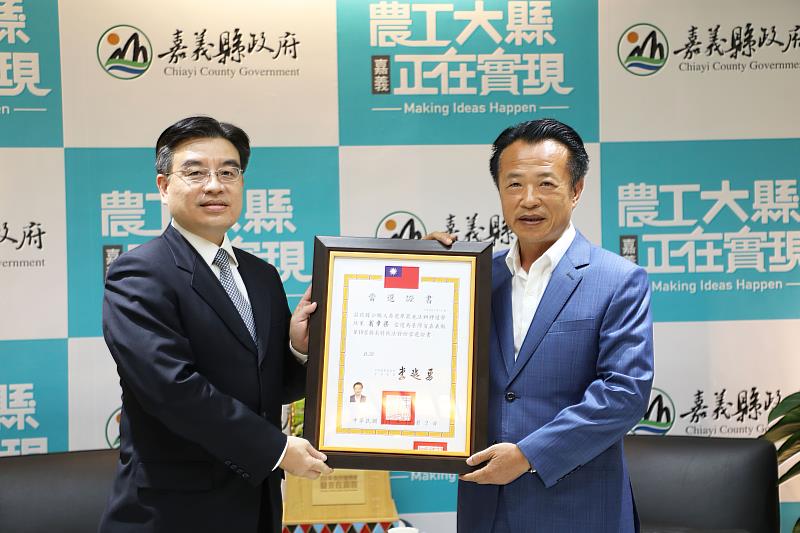 蒙志成也在致詞時,親自祝賀翁縣長高票連任嘉義縣第19屆縣長,相信鄉親都透過民主選舉選出最適任的優秀縣長,僅代表中央選舉委員會表示恭喜,並致送當選證書。