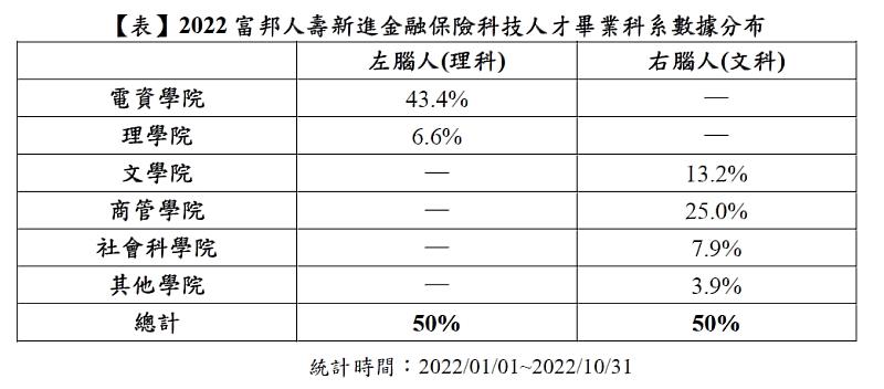 金融科技是個具有前瞻性的職涯領域,但是否需要出身理科背景的左腦人才能勝任?答案是跨領域整合能力更加關鍵。根據2022富邦人壽人才招募數據統計(表),從事金融科技工作的新進員工中,畢業於理科系所的左腦人比例為50%(含電資學院、理學院),與來自文組的右腦人各佔山頭(含文學院、商管學院、社會科學院與其他)。