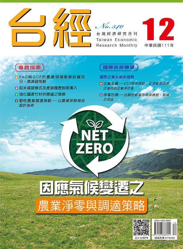 (中央社訊息服務20221214 11:27:45)農業受氣候變遷影響甚巨,升溫1.5度對農業生產是巨大挑戰,不只影響農民、更影響所有消費者。為減少氣候變遷帶來的農業損失,農業部門祭出淨零與調適雙管齊下,並設定2040年達到農業淨零排放目標,相較國家2050淨零排放策略提早十年,運用農業科技與得天獨厚之自然環境碳匯,將更有機會貢獻其他產業部門。台灣經濟研究院出版的十二月號《台經月刊》以因應氣候變遷之農業淨零與調適策略為主題,探討國內外相關策略與措施;另一方面,近幾年投入ESG與淨零(Net Zero)目標的實踐已成為企業標配,雖然有不同的規範與壓力,但過程中也衍生出多元商機,國際企業永續新興領域也逐步浮現。台經月刊將帶領讀者掌握國際企業永續新趨勢,嗅出新商機。