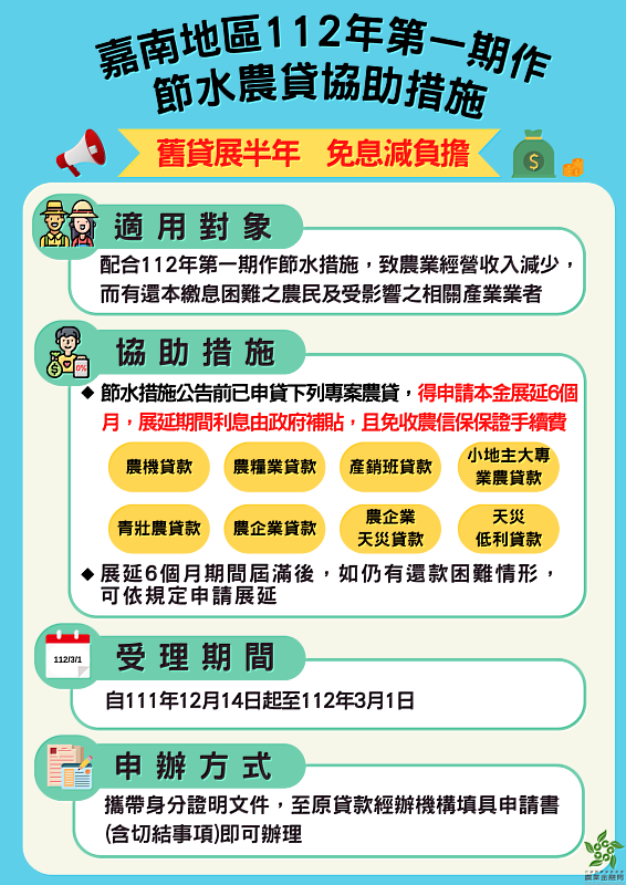 配合嘉南地區112年第一期作節水措施,提供農貸展延免息措施