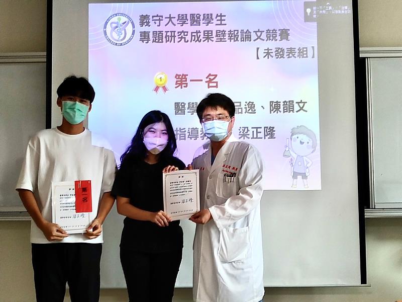 獲得研究組第一名的是醫學系四年級學生何品逸與陳韻文,他們以義大醫院新進的「加馬刀系統(Leksell Gamma Knife ICON)」為研究主題,針對加馬刀技術不用開顱就可透過放射線精準打擊到腫瘤位置治療腦部疾病,加以探討此項技術除了可運用在人體腦部外,在其他身體部位是否可精準應用,並提供相關數據於臨床中以作參考。何品逸與陳韻文皆表示,很感謝學校鏈結醫院資源,提供平台與機會讓醫學院的學生學習,藉競賽活動不僅學到相關組織切片技巧與理論等,也從實驗做中學累積實戰經驗。