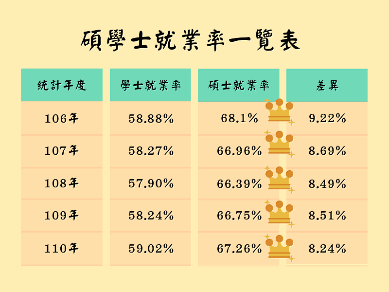 (中央社訊息服務20221216 13:23:01)許多人會在論壇或社群平台上提出疑問及討論:「多花兩年的時間念研究所拚碩士學歷,真的有比較好嗎?」答案是──有!依據勞動部統計處110年初任人員薪資統計結果顯示,110年初任人員薪資平均為32,000元,其中大學畢業(學士)平均薪資為30,000元、研究所畢業(碩士)平均為47,000元,兩者相差17,000元;又從近五年碩學士的就業率比較可知,碩士學歷在現今的就業市場具有相對優勢。
