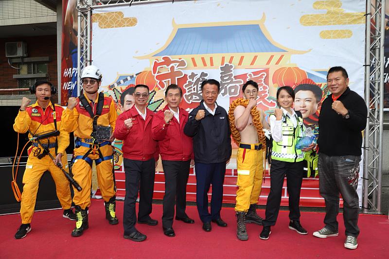 現場由消防人員手持各式裝備,包括救災儀器、餘震偵測儀、氧氣球等走秀登場,向眾人展現平時工作狀況,布袋分隊消防員李旺在寒冷的年末脫下上衣秀出健美身材,他同時也是農民曆6月份的內頁人物,非常有看頭。