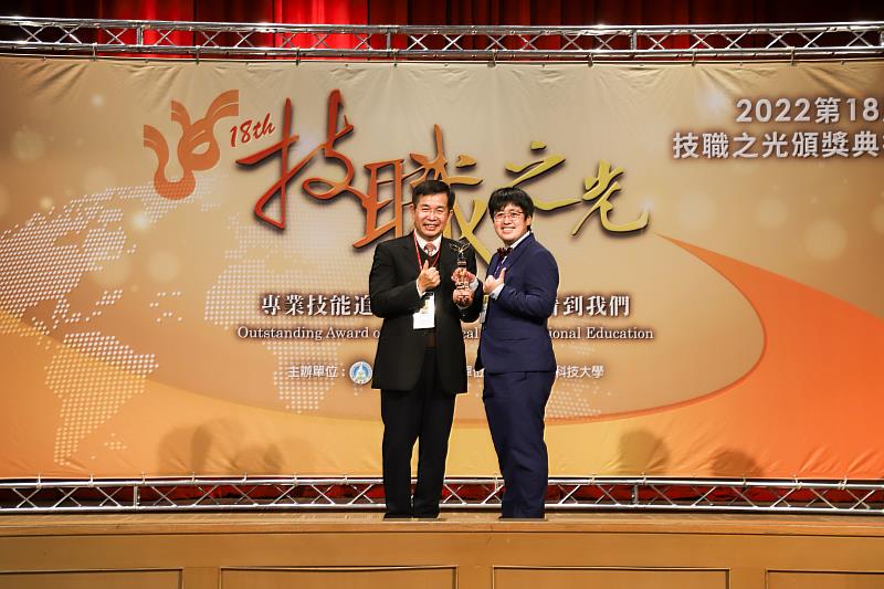(中央社訊息服務20221230 14:00:47)教育部於12月29日(四)交通部國際會議廳隆重舉行「第十八屆技職之光」頒獎典禮,國立高雄科技大學(以下簡稱高科大)由李副校長嘉紘代表出席。本屆高科大的優秀學生得主有水圈學院水產科技產業博士班林佳樺同學榮獲「技職傑出獎」之產養殖與食品達人,模具工程科何亭萱、楊茗棋、龐褘心同學、土木工程科余佳芳同學、機械工程系機械科張建雄同學獲頒「競賽卓越獎」殊榮。